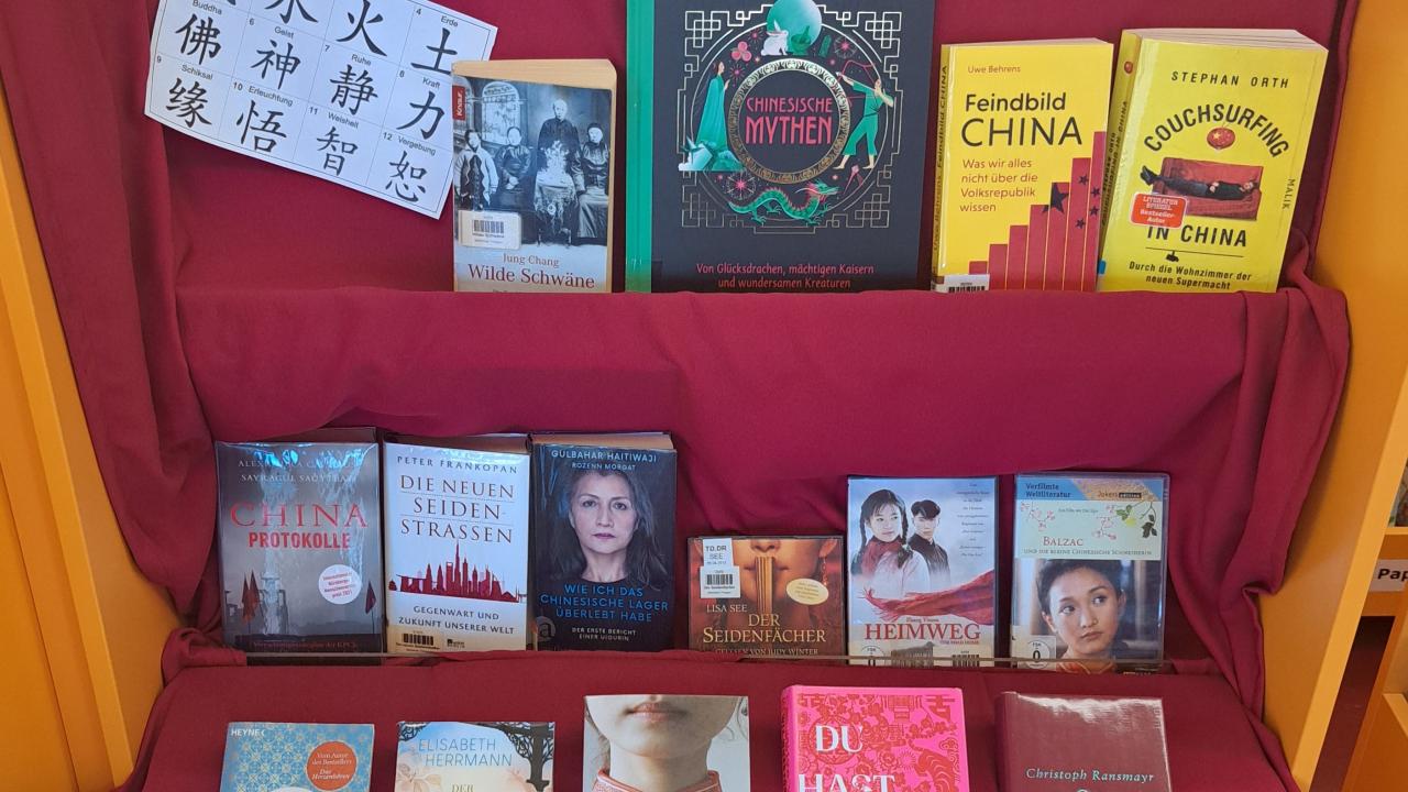 Verschiedene Medien zum Thema China versammelt an einem Tisch --> Sachbücher, Romane, Biografien, Hörbuch und Filme