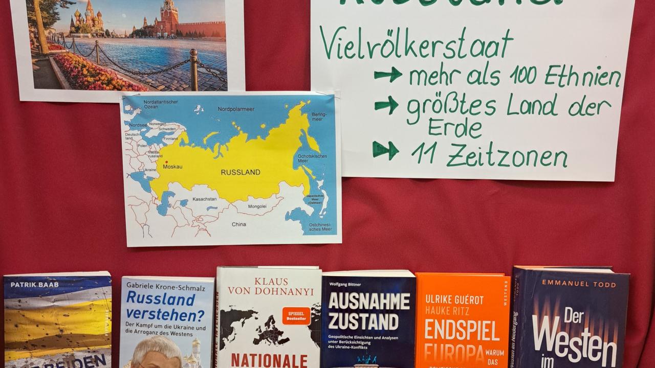 Viele Bücher, Film und CD-Hörbuch zum größten Land der Erde, Russland, versammeln sich am Medientisch. Zu finden sind aktuelle Sachbücher zum Thema Ukrainekrieg abseits des Mainstreams, russische Klassiker von Tolstoi bis Dostojewski, Romane, Biografien, Russische Märchen und Reiseberichte. Viel Spaß beim Schmökern und Lesen.